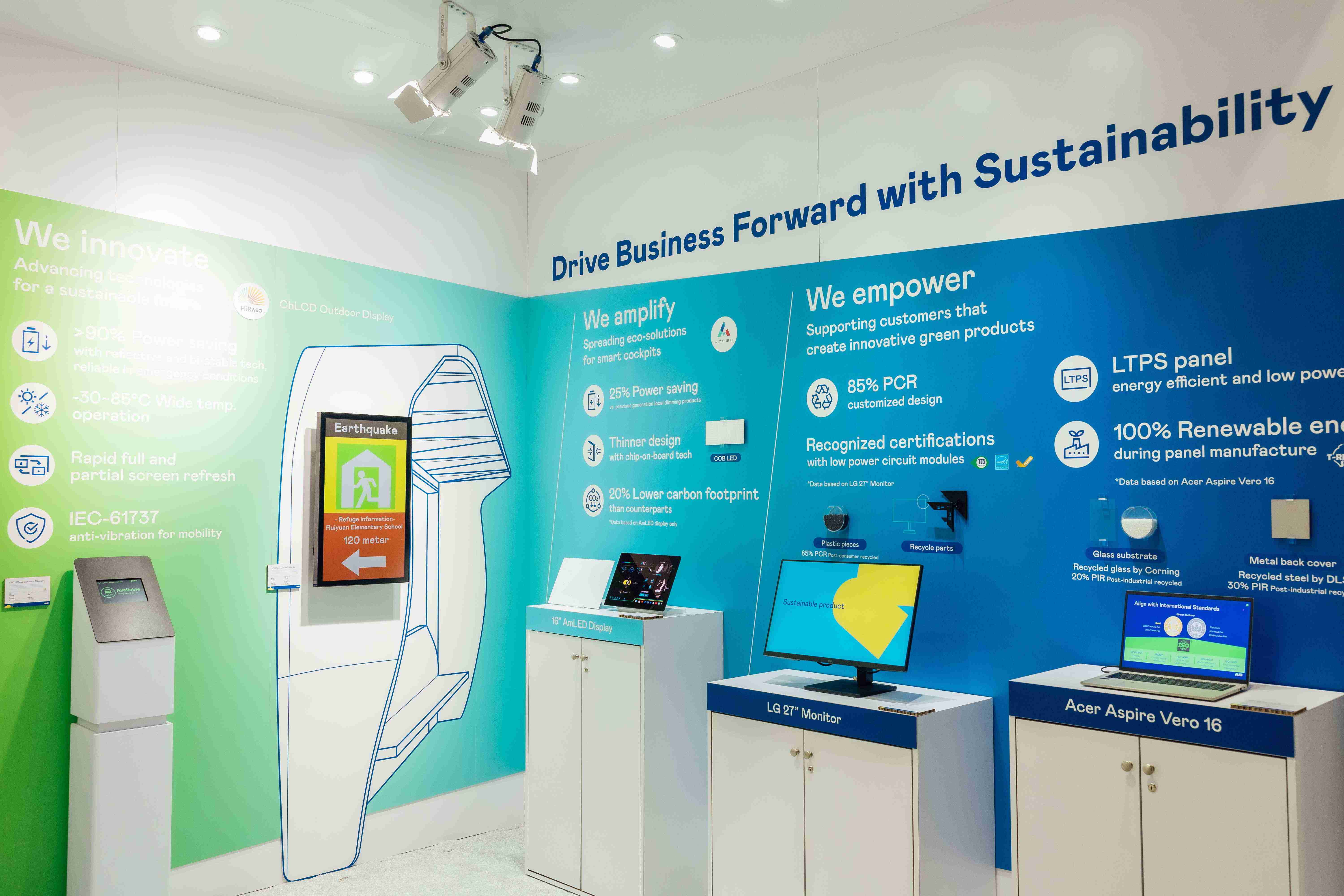 彩霸王运用创新显示技术HiRaso胆固醇液晶双稳态技术达到显示零耗能、、、扩大节能省电的AmLED显示技术应用于车用产品、、、、以再生的消费后回收(PCR)塑料及全绿电生产之面板,,应用于笔电及萤幕,,增加绿色价值。。