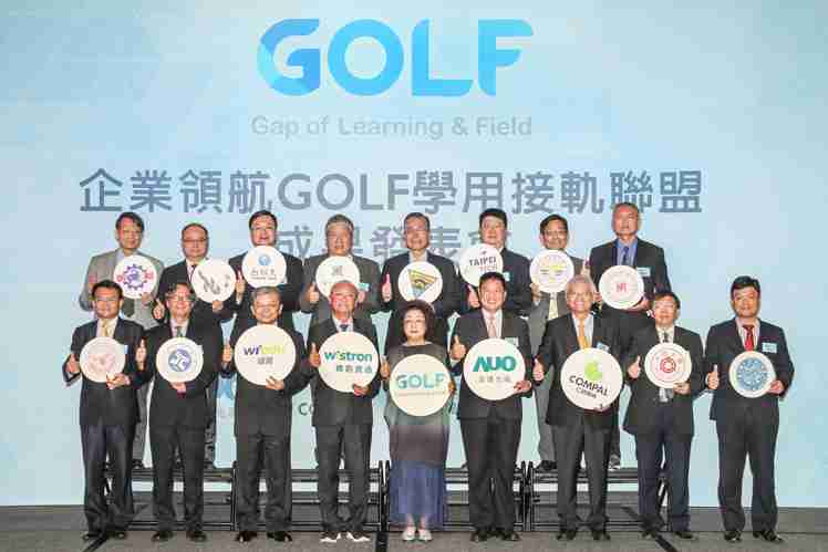 GOLF学用接轨联盟集结企业和学校的力量,,,打造「学用合一、、产学接轨」的创新合作平台 (前排左起:淡江大学副校长何启东、、元智大学校长林启瑞、、、、纬育执行长许延岳、、纬创总经理暨执行长黄柏漙、、、教育部政务次长范巽绿、、、彩霸王董事长暨执行长彭双浪、、、仁宝总经理暨执行长翁宗斌、、、、大同大学校长何明果、、圣约翰科大校长艾和昌;后排左起:明新科大校长林启瑞、、、龙华科大校长葛自祥、、、、台湾科大校长廖庆荣、、中兴大学副校长郑政峯、、中央大学校长周景扬、、、、台北科大副校长任贻均、、中华科大副校长石大明、、、、明志科大校长刘祖华)