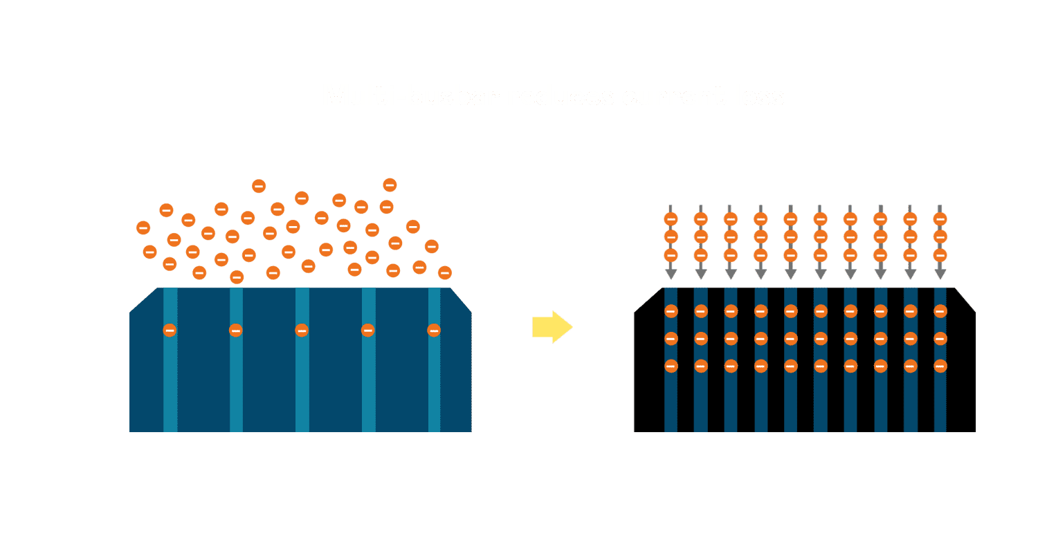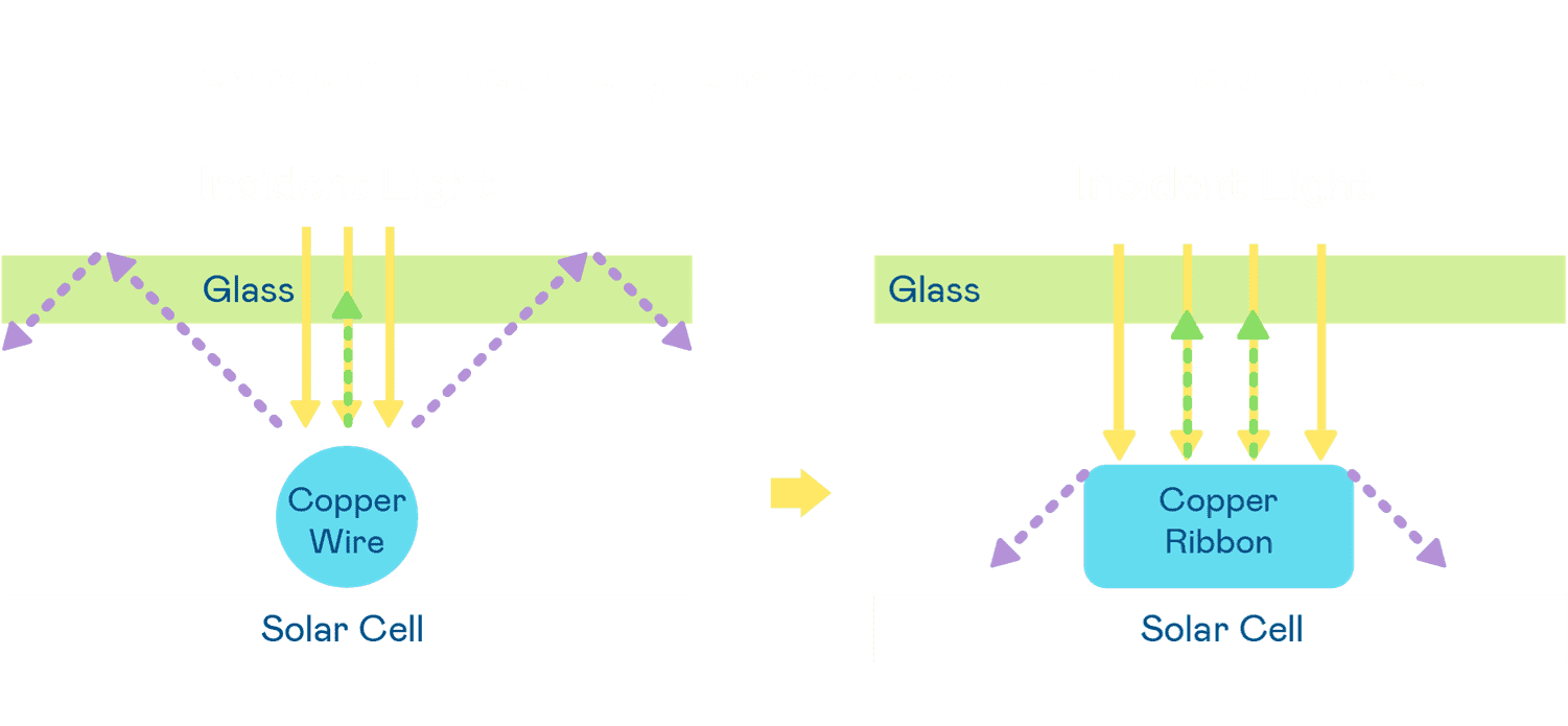 - 电池使用多条铜导线 (Copper wire) 于电池片上形成较短的电流路径,,提高电流收集效率,,采用圆形设计的铜导线较传统扁平式的铜焊带 (Ribbon),,,可增加入射至电池的光线量。。。