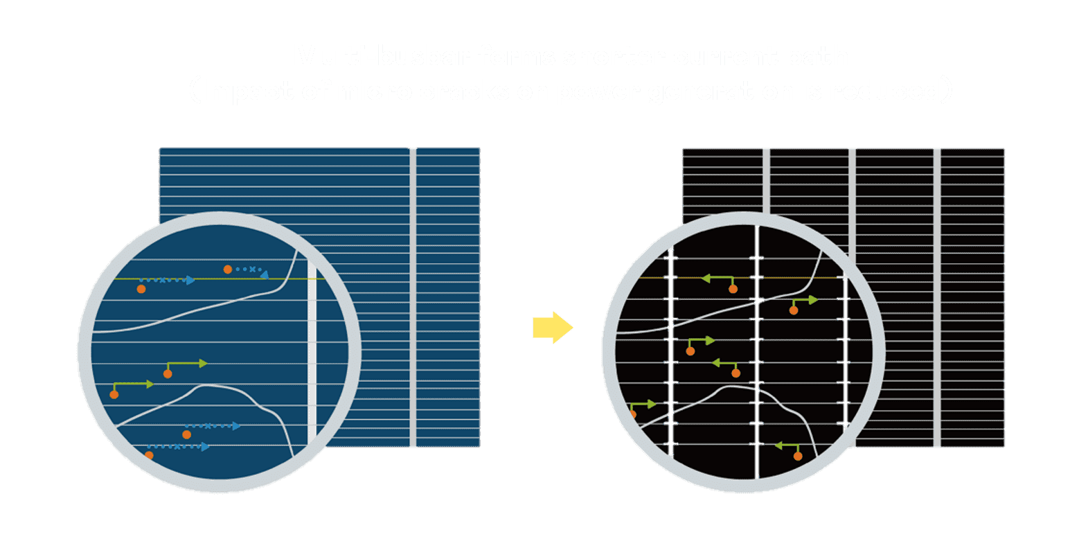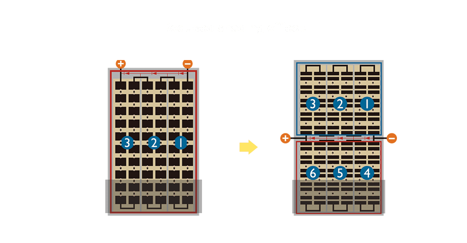 - 结合半切电池,,,降低遮阴影响、、提升模组抗隐裂能力、、、并减少电阻损耗,,,进一步提升模组发电效能。。。